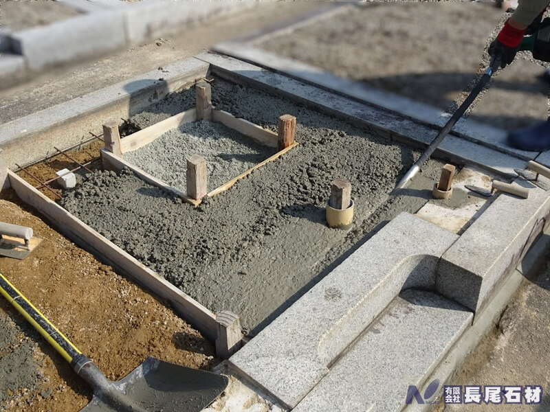 基礎コンクリートの完成です。中央はお骨を納める場所ですので、コンクリートは打たず砂土で仕上げています。
